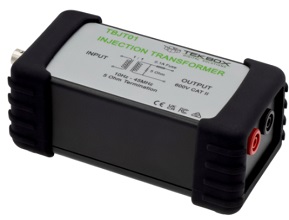 The TBJT01 is a wideband injection transformer for control loop stability measurements. It provides galvanic isolation between the swept signal source and the control loop. The injection transformer is internally terminated with a 5 Ohm resistor and protected with a 100 mA fuse. The usable frequency range is 10 Hz to 45 MHz.